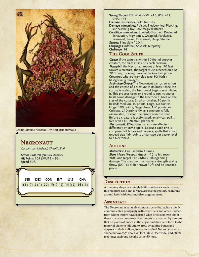 The Necronaut is an undead monstrosity that abhors life. It communicates grudgingly with constructs and other undead, from whom others have learned what little is known about these macabre creatures. Necronauts are created by demons that on plains of bones in the abyss and then sent forth to the material plane to kill, and to grow by adding bones and corpses to their hulking forms. Individual Necronauts vary in shape but average about 20 feet tall, 20 feet wide, and 30-40 feet long; each one weighs some 50 tons.