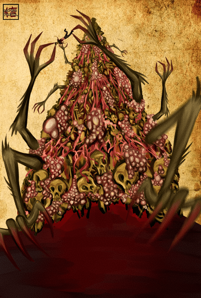 A towering shape seemingly built from bones and corpses, this creature rolls and lurches across the ground, searching around itself with four massive, angular arms.