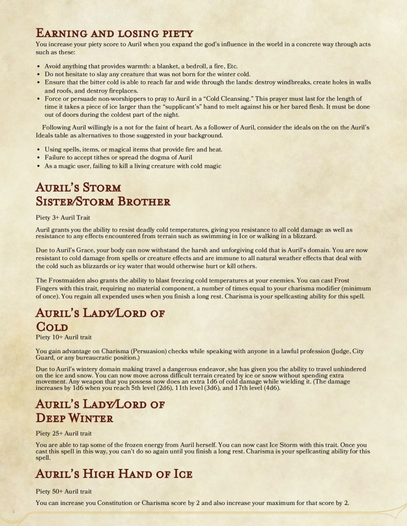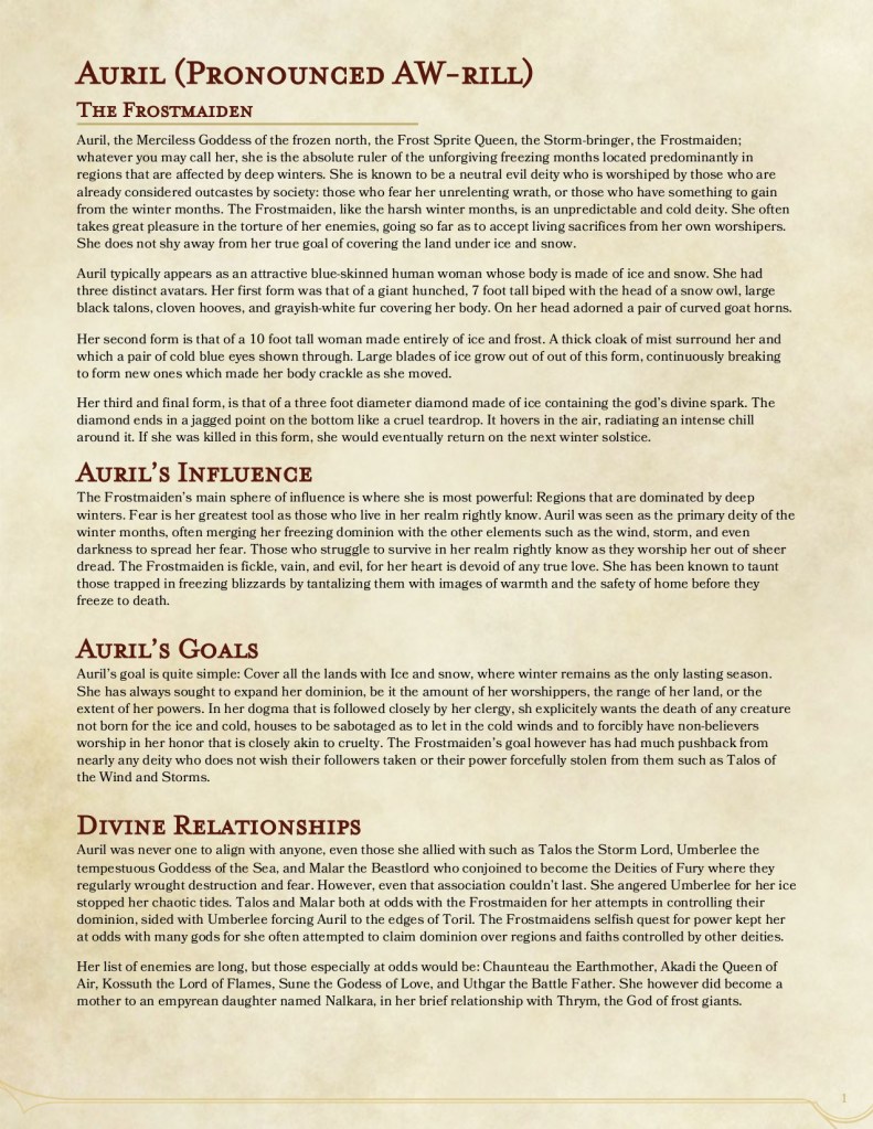 This will be the third god that I’ve done for the book I am currently working on. (title TBD) Simply its about adding piety scores (bascially perks for worshiping a particular god and followingtheir dogma) to Forgotten Realms gods. Auril was a fun one to do especially if you like following an evil deity. I hope you enjoy and I am always open for criticism!
