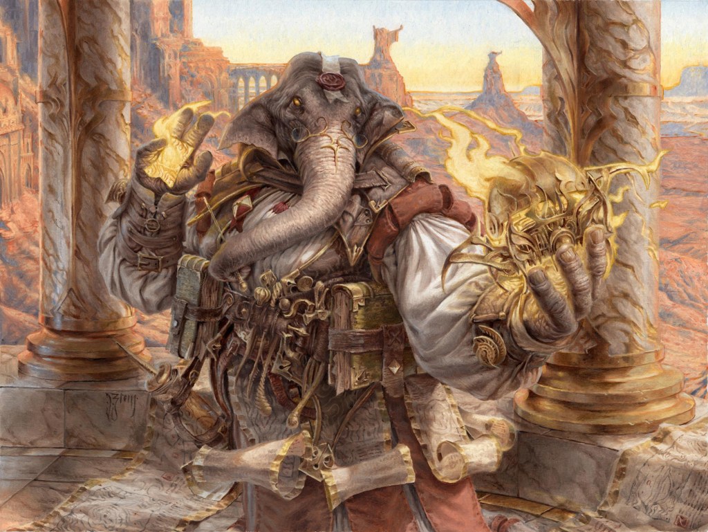 Even by Lorehold standards, Osgir the stone giant is obsessed with relics of the past. A professor of order, he treasures every connection to old civilizations, whether it’s a magnificent jeweled crown or an old shovel. As a student, he constantly spent time in detention for hoarding the best finds from Lorehold dig sites in his room; he lost count of how many times he was sternly told, “History belongs to us all!” So, naturally, he mastered the magical art of duplicative restoration. Not only can he perfectly recreate an ancient object or device from the smallest scrap, but he can also produce a second, identical version for his personal collection. He displays something different every week in his Lorehold office, from a mighty sword of demon-slaying to a delicate elven music box.